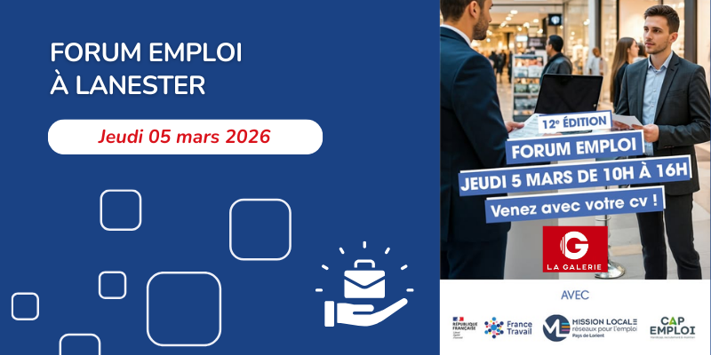 Rendez-vous le jeudi 05 mars 2026, pour une nouvelle édition du forum de l’emploi dans La Galerie G Lanester, à l’initiative de France Travail, la Mission Locale du Pays de Lorient, Cap emploi 56 et de la direction de La Galerie.